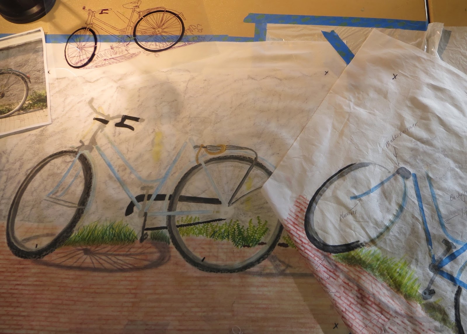 Kim J. had a bicycle photograph she had taken in Europe. You can somewhat see the process here... upper left a portion of her 8 x 10 reference photo appears... To it's right... a tracing on acetate of her photographed bike. What is not seen here.. is the enlarged black and white drawing of her tracing... it's underneath her fabric. Kim also took a smart and scientific approach to prepping to paint something so intricate... She did a 'rough draft' of sorts to figure out the challenges ( it's on the right and the photo below.) Then she painted the real deal.